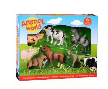 Beautiful set farm animals including a pig, cow, donkey, sheep, horse and goat. This set could very well fit by example play rug zoo, little village or farm.
