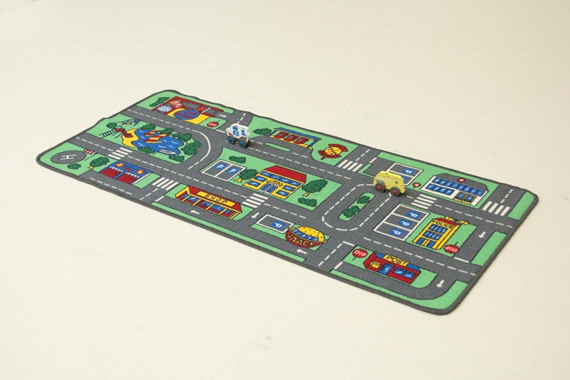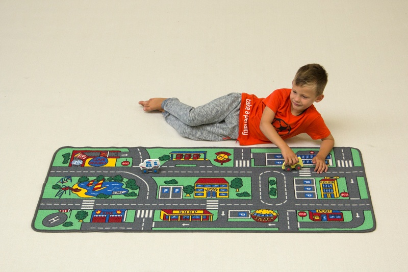 Play rug Little Town has numerous activities which can be had without ever leaving the border of this city-themed rug! This colourful play rug Little Town has everything for hours of fun. All common city buildings are here; a police station, hospital, church, restaurants, parking garage and bus stops. It is also possible to take a plane and fly to another town! This play rug has an extensive road network. You can drive around with cars and build houses by yourself.